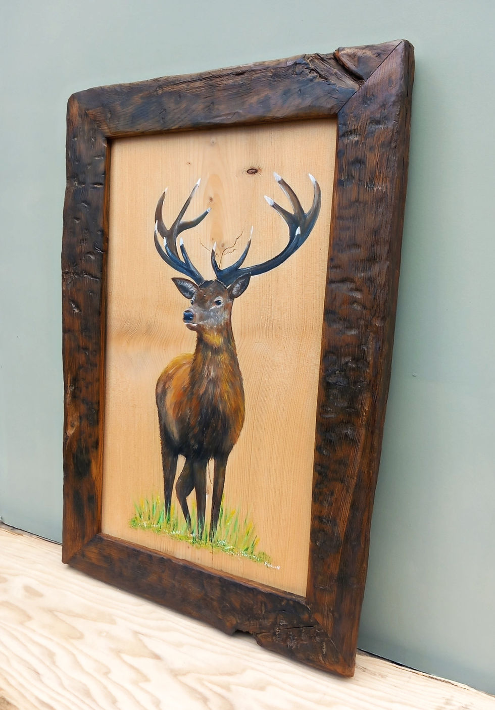"Xavier" - Large Framed Original Stag Painting on Reclaimed Oak